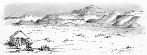 Later in the day we passed through a tract in which there were excellent illustrations of the formation of terraces by torrent-action. The strata consisted of soft marly limestones and shales, and when horizontal were scooped out into terraces, with intermediate ravines; when highly inclined, into a succession of escarpments and slopes. It was a waste wilderness of crumbling strata; but full of interest to the geologist. The terraces of the Wâdy Hamr, on our next day's march, were also remarkable, and reminded me of the pictures I had seen of those in the Colorado region of America.