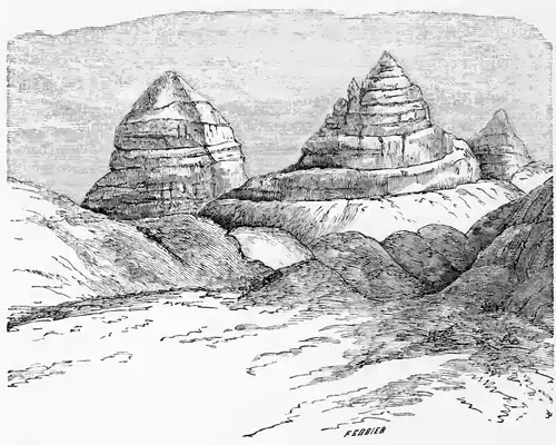 Later in the day we started along the Wâdy Suwig, which stretches in an easterly direction, skirting the granitic and sandstone districts, and leading us in the direction of Mount Sinai. The scenery was interesting, from the numerous examples of castellated cliffs and isolated tors of the sandstone strata, perched on bases of granite or porphyry. Amongst the most remarkable of these are the two great pyramids, of which the larger is called Jebel el Malah. Of this, perhaps, the finest view is that obtained when looking south. They are formed of horizontal courses of red sandtone resting on granite; and that to the left has a quadrangular form, the faces of the pyramid being well defined.