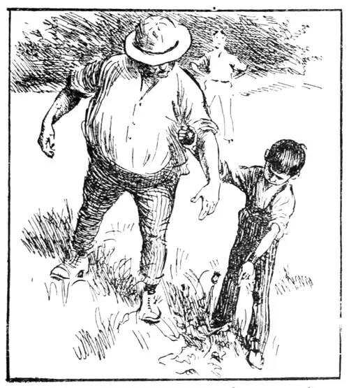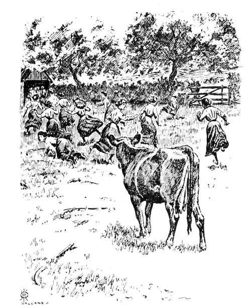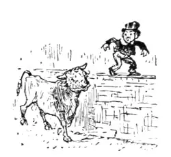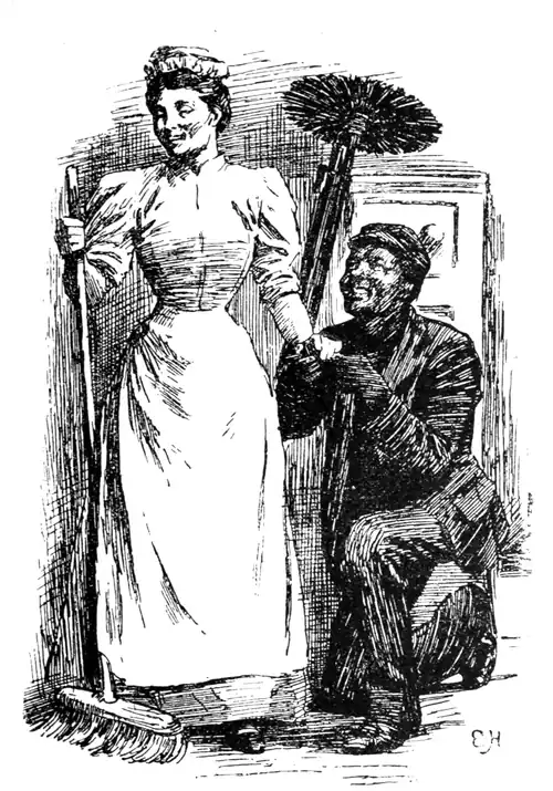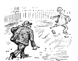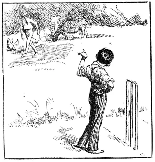Boy (reassuringly). "It's all right, miss, I'm only looking for our cricket-ball!"