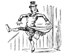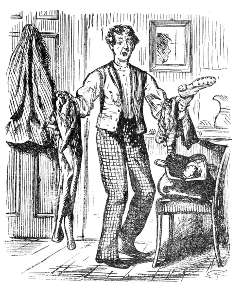Togswill (in the washing room at the office, proceeding to dress for the De Browncy's dinner-party). "Hullo! What the dooce"—(pulling out, in dismay, from black bag, a pair of blue flannel tights, a pink striped jersey, and a spiked canvas shoe).—"Confound it! Yes!—I must have taken that fellow's bag who said he was going to the athletic sports this afternoon, and he's got mine with my dress clothes!!"
