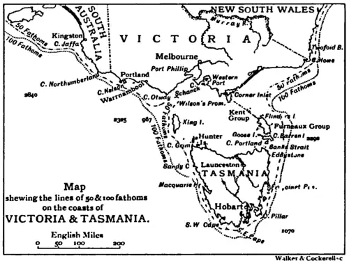 - ↑ Taken from the Admiralty Chart. Mr. Everett, chief draughtsman of the Department of Mines and Water Supply, has directed my attention to a paper read by Dr. Becker before the Philosophical Institute of Victoria, in which he points out the features referred to in this passage (vol. ii. p. 15).