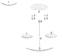 1 is the Katu of the Yuri-ulu; 2, spectators, women and children; 3, the Kalti; 4, the two Pirha, each lying on two spears in front of a Kalti; 5, the great Pirha; 6 and 7, the Katus of the Ngaperi; 8, the Ngandri sitting in a row; 9, the Katu of the Ngaperi.[34]