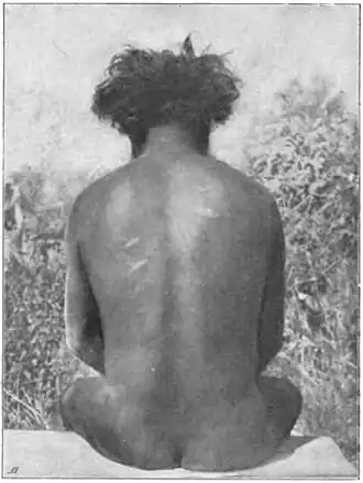 - ↑ The Kami and Kadi have charge of the boy during the ceremonies, and lead him away after the operation has been performed. The Neyi and the Kaka provide food for him and accompany him. Men of these relationships are always chosen who are much older than he, in order that they may instil respect for the laws which they have to impress upon him. Kadi is the wife's brother, or the sister's husband, which is the same person. Neyi is the elder brother, Kaka is the mother's brother. It must be borne in mind that these are group relations, own and tribal.
