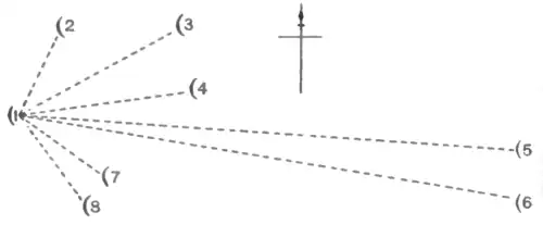 In order to fix as accurately as possible these positions of the camps of a related group, I got some of the Kurnai to point out on a piece of ground where various members of a family group, whom I would name, would camp. From their statements I formed a diagram, and from it I extracted the following particulars. The starting-point is supposed to be the camp of a man and his wife. The directions are given approximately by compass bearings, and the distances by paces. The nature of the ground required that the encampment should extend in a certain direction.