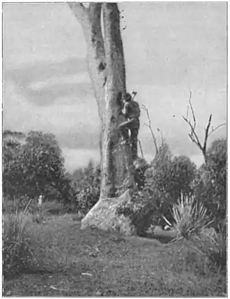 FIG. 53.—A KURNAI MAN CLIMBING A TREE IN SEARCH OF AN OPOSSUM. received by the wife's parents and by the husband's parents is shared by them with their family.