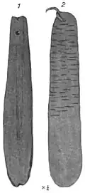 FIG. 29.—1. YUIN BULL-ROARER, MUDTHI; 2. DIERI BULL-ROARER, YUNTHA. who lived at Twofold Bay, should come up to Manero with some of his men and meet me on the occasion of my next visit to that part of New South Wales. At this meeting, amongst other things, we discussed the advisability of holding a Kuringal, and it was at last decided that one should be held. I was greatly struck by the manner in which the old man received a bull-roarer which I had made for the occasion, it being the facsimile of those with which I had played as a boy. I drew it from a small bag and secretly presented it to him, saying: "This I used when I was a lad, and you know that these mudthi were first made by that great one (pointing upwards), and that he ordered your fathers to hold the Kuringal, and to make your boys into men." He and Yibai, who was standing by him, each placed his hand over his mouth, and looked at the bull-roarer for some moments. Then the Yuin Gommera Brupin said: " Yes, that is it," and he called the three men whom he had brought with him, and holding the bull-roarer before him said: "This is a mudthi which he (pointing to me) has brought from a long way off. It is the same as that which we know of, and which was given to our fathers by that great Biamban you know about." The men looked at it with every appearance of awe, but said nothing, and then returned to their fire.