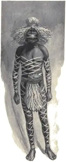 - ↑ Kaiung is the women's apron, which in the old times was worn by the Krauun after this ceremony until she married, when it was discarded. I believe that Djiitgun, the female totem, the "women's sister," ought also to have been invoked during the marching round. I noticed its omission, but neglected at the time to inquire the reason, and I have not since had a chance of so doing.