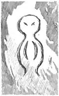 The men of the contingent are taken by the path and shown the various representations, or emblems, or figures as they may be called, with each of which a magical substance, that is, a Joïa, which is used by the medicine-men, is specially connected. Indeed some of them have certain Joïas peculiar to themselves. The following is a description of the figures and proceedings at this part of the Bunan ground. The series commences with that figure nearest to the greater Bunan.1. Gurama, that is, "a hole," otherwise "a grave." At it one of the medicine-men dances the magical dance peculiar to these ceremonies, in which he squats down near to the ground while dancing, moving his legs alternately from one side to the other, at the same time swinging his arms perpendicularly in front of his body. He seems possessed by a sort of frenzy while doing this, and apparently brings up from within himself and exhibits between his teeth the Joïa peculiar either to himself or to the object exhibited or sung. In the case of the Guraua, the Joïa is a quartz crystal, which is considered to be one of the most deadly of the magical substances which the Gomeras receive from Daramulun.