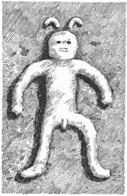 4. Daramulun. A figure the size, or more than the size, of life is made of earth in relief representing a man in the act of dancing the magic dance, and surrounded by the implements and weapons of the Yuin. These were, it is said, invented by Daramulun, and given by him to their fathers. Round this all the medicine-men dance, shouting the name of Daramulun, and each producing his special Joïa; amongst others, one looked like a black membrane, and another was, to all appearances, a piece of one of the lesser intestines of some small animal, which the Gommera let hang from, and then withdrew into, his mouth.
