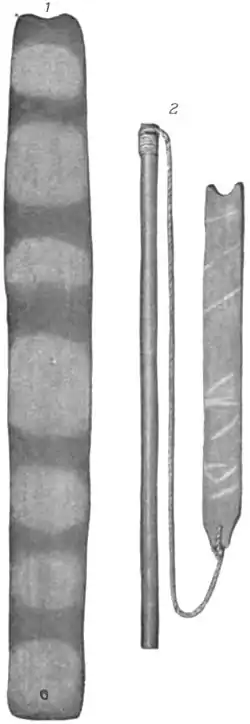 - ↑ These staves should properly have been "yam-sticks," but these implements are no longer used by the Kurnai, flour having replaced the former food of roots or tubers. The bunches of leaves which play a part in these ceremonies are called "Jerung"—branches, boughs, or twigs.