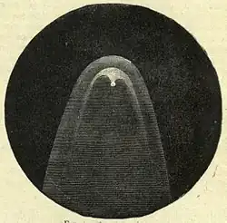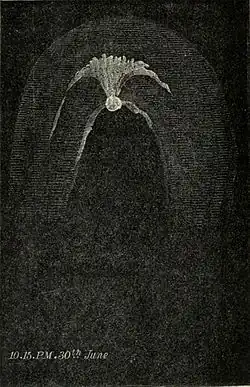 With regard to the physical constitution of the comet, M. Wolf points out that while Coggia's comet (1874)—the only large comet visible on the horizon of Paris since spectrum analysis came into use—was at first telescopic, developed rapidly, and disappeared at the most interesting stage, the present comet comes to us already very much developed after its passage through perihelion. The transformations of the nucleus and its envelopes are extremely rapid (as the drawings show). In the large telescope the segmentation of the head, which Bond found in Donati's comet, was distinctly visible on June 24; the smallest instruments did not show it.