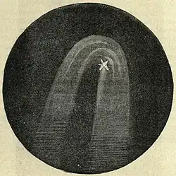 the bright jet had disappeared, giving place to a fan, of which the left-hand side was the brighter. A small star was seen through the coma, a, which the comet rapidly passed.