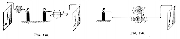 If I connect an insulated metal plate P, Fig. 11/175, to one of the terminals T of the induction coil by means of a wire, though this plate be very well insulated, a current passes through the wire when the coil is set to work. First I wish to give you evidence that there is a current passing through the connecting wire. An obvious way of demonstrating this is to insert between the terminal of the coil and the insulated plate a very thin platinum or german silver wire w and bring the latter to incandescence or fusion by the current. This requires a rather large plate or else current impulses of very high potential and frequency. Another way is to take a coil C, Fig. 11/175, containing many turns of thin insulated wire and to insert the same in the path of the current to the plate. When I connect one of the ends of the coil to the wire leading to another insulated plate P1, and its other end to the terminal T1 of the induction coil, and set the latter to work, a current passes through the inserted coil C and the existence of the current may be made manifest in various ways. For instance, I insert an iron core within the coil. The current being one of very high frequency, will, if it be of some strength, soon bring the iron core to a noticeably higher temperature, as the hysteresis and current losses are great with such high frequencies. One might take a core of small size, laminated or not, it would matter little; but ordinary iron wire 1/16th or 1/8th of an inch thick is suitable for the purpose. While the induction coil is working, a current traverses the inserted coil and only a few moments are sufficient to bring the iron wire i to an elevated temperature sufficient to soften the sealing wax s and cause a paper washer p fastened by it to the iron wire to fall off. But with the apparatus such as I have here, other, much more interesting, demonstrations of this kind can be made. I have a secondary s, Fig;. 12/176, of coarse wire, wound upon a coil similar to the first. In the preceding experiment the current through the coil C, Fig. 11/175, was very small, but there being many turns a strong heating effect was, nevertheless, produced in the iron wire. Had I passed that current through a conductor in order to show the heating of the latter, the current might have been too small to produce the effect desired. But with this coil provided with a secondary winding, I can now transform the feeble current of high tension which passes through the primary P into a strong secondary current of low tension, and this current will quite certainly do what I expect. In a small glass tube (t, Fig. 12/176), I have enclosed a coiled platinum wire, w, this merely in order to protect the wire. On each end of the glass tube is sealed a terminal of stout wire to which one of the ends of the platinum wire w, is connected. I join the terminals of the secondary coil to these terminals and insert the primary p, between the insulated plate P1, and the terminal T1, of the induction coil as before. The latter being set to work, instantly the platinum wire w is rendered incandescent and can be fused, even if it be very thick.