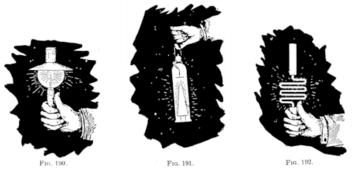 Referring to Fig. 19a/183a, B and B1 are very stout copper bars connected at their lower ends to plates C and C1, respectively, of a condenser, the opposite plates of the latter being connected to the terminals of the secondary S of a high-tension transformer, the primary P of which is supplied with alternating currents from an ordinary low-frequency dynamo G or distribution circuit. The condenser discharges through an adjustable gap d d as usual. By establishing a rapid vibration it was found quite easy to perform the following curious experiment. The bars B and B1 were joined at the top by a low-voltage lamp l3 a little lower was placed by means of clamps C C, a 50-volt lamp l2; and still lower another 100-volt lamp l1; and finally, at a certain distance below the latter lamp, an exhausted tube T. By carefully determining the positions of these devices it was found practicable to maintain them all at their proper illuminating power. Yet they were all connected in multiple arc to the two stout copper bars and required widely different pressures. This experiment requires of course some time for adjustment but is quite easily performed.
