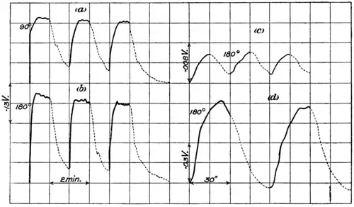 If sufficient time be allowed the recovery is complete. (In the curves given only 30 seconds were allowed, hence the recovery was not complete.) On the cessation of disturbance the electromotive variation gradually disappears, the wires returning to their original condition, after which similar cycles of operation may be repeated for any length of time.