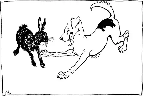 A YOUNG Hound started a Hare, and, when he caught her up, would at one moment snap at her with his teeth as though he were about to kill her, while at another he would let go his hold and frisk about her, as if he were playing with another dog. At last the Hare said, “I wish you would show yourself in your true colours! If you are my friend, why do you bite me? If you are my enemy, why do you play with me?”