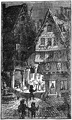 We took a turn around the town, after dinner, and found it fully as interesting in the moonlight as it had been in the day time. The streets were narrow and roughly paved, and there was not a sidewalk or a street lamp anywhere. The dwellings were centuries old, and vast enough for hotels. They widened all the way up; the stories projected further and further forward and aside as they ascended, and the long rows of lighted windows, filled with little bits of panes, curtained with figured white muslin and adorned outside with boxes of flowers, made a pretty effect. The moon was bright, and the light and shadow very strong; and nothing could be more picturesque than those curving streets, with their rows of huge high gables leaning far over toward each other in a friendly