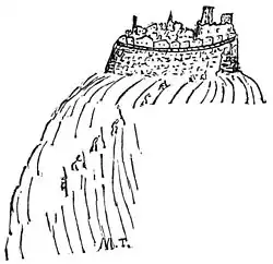 There is no house outside the wall on the whole hill, or any vestige of a former house; all the houses are inside the wall, but there isn't room for another one. It is really a finished town, and has been finished a very long time. There is no space between the wall and the first circle of buildings; no, the village wall is itself the rear wall of the first circle of buildings, and the roofs jut a little over the wall and thus furnish it with eaves. The general level of the massed roofs is gracefully broken and relieved by the dominating towers of the ruined castle and the tall spires of a couple of churches so, from a distance Dilsberg has rather more the look of a king's crow than a cap.