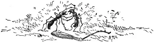 clothes, moistens his hands, grabs his property viciously, yanks it this way then that, shoves it ahead of him a moment, turns tail and lugs it after him another moment, gets madder and madder, then presently hoists it into the air and goes tearing away in an entirely new direction; comes to a weed; it never occurs to him to go around it; no, he must climb it; and he does climb it, dragging his worthless property to the top—which is as bright a thing to do as it would be for me to carry a sack of flour from Heidelberg to Paris by way of Strasburg steeple; when he gets up there he finds that that is not the place; takes a cursory glance at the scenery and either climbs down again or tumbles down, and starts off once more—as usual, in a new direction. At the end of half an hour, he fetches up within six inches of the place he started from and lays his burden down; meantime he has been over all the ground for two yards around, and climbed all the weeds and pebbles he came across. Now he wipes the sweat from his brow, strokes his limbs, and then marches aimlessly off, in as violent a hurry as ever. He traverses a good deal of zig-zag country, and by and by stumbles on his same booty again. He does not remember to have ever seen it before; he looks around to see which is not the way home, grabs his bundle and starts; he goes through the same adventures he had before; finally stops to rest, and a friend comes along. Evidently the friend remarks that a last year's grasshopper leg is a very noble acquisition, and inquires where he got it.