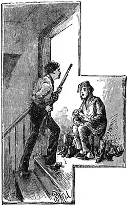 About midnight the noises dulled away, and I was sinking to sleep, when I heard a new and curious sound; I listened: evidently some joyous lunatic was softly dancing a "double shuffle" in the room over my head. I had to wait for him to get through, of course. Five long, long minutes he smoothly shuffled away—a pause followed, then something fell with a heavy thump on the floor. I said to myself "There—he is pulling off his boots—thank heavens he is done." Another slight pause—he went to shuffling again! I said to myself, "Is he trying to see what he can do with only one boot on?" Presently came another pause and another thump on the floor. I said "Good, he has pulled off his other boot—now he is done." But he wasn't. The next moment he was shuffling again. I said, "Confound him, he is at it in his slippers!" After a little came that same old pause, and right after it that thump on the floor once more. I said,