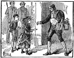 The stocks of goods in the shops were not extensive, generally. In the vestibule of what seemed to be a clothing store, we saw eight or ten wooden dummies grouped together, clothed in woolen business-suits and each suit marked with its price. One suit was marked 45 francs—nine dollars. Harris stepped in and said he wanted a suit like that; Nothing easier: the old merchant dragged in the dummy, brushed him off with a broom, stripped him, and shipped the clothes to the hotel. He said he did not keep two suits of the same kind in stock, but manufactured a second when it was needed to re-clothe the dummy.