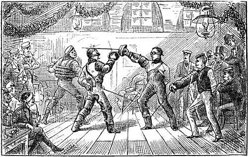 a perfect stillness, a breathless interest reigned. I felt that I was going to see some wary work. But not so. The instant the word was given, the two apparitions sprang forward and began to rain blows down upon each other with such lightning rapidity that I could not quite tell whether I saw the swords or only the flashes they made in the air; the rattling din of these blows, as they struck steel or paddings was something wonderfully stirring, and they were struck with such terrific force that I could not understand why the opposing sword was not beaten down under the assault. Presently, in the midst of the sword-flashes, I saw a handful of hair skip into the air as if it had lain loose on the victim's head and a breath of wind had puffed it suddenly away.
