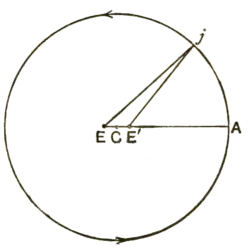 As in the case of the moon, he used as deferent an eccentric circle (centre c), but instead of making the centre j of the epicycle move uniformly in the deferent, he introduced a new point called an equant (e'), situated at the same distance from the centre of the deferent as the earth but on the opposite side, and regulated the motion of j by the condition that the apparent motion as seen from the equant should be uniform; in other words, the angle a e' j was made to increase uniformly. In the case of Mercury (the motions of which have been found troublesome by