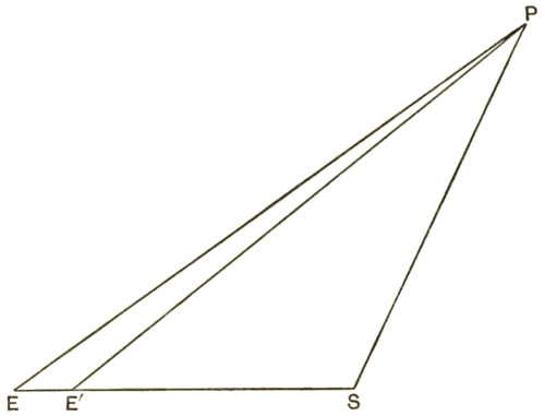 observation were sufficiently improved to measure with some accuracy the apparent sizes of the sun and moon, and so check the variations in their distances. But any variation in the distance of the earth from the sun would affect not merely the distance, but also the direction in which a planet would be seen; in the figure, for example, when the planet is at p and the sun at s, the apparent position of the planet, as seen from the earth, will be different according as the earth is at e or e'. Hence the epicycles and eccentrics of Coppernicus, which had to be adjusted in such a way that