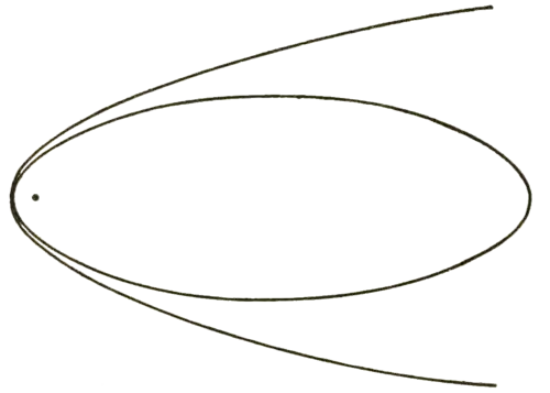 then its positions when not very far from the sun would be almost the same as if it moved in an elongated ellipse (see fig. 73), and consequently it would hardly be possible to distinguish the two cases. Newton accordingly worked out the case of motion in a parabola, which is mathematically the simpler, and found that, in the case of a comet which had attracted much attention in the winter 1680-1, a parabolic path could be found, the calculated places of the comet in which agreed closely with those observed. In the later editions of the Principia the motions of a number of other comets were investigated with a similar