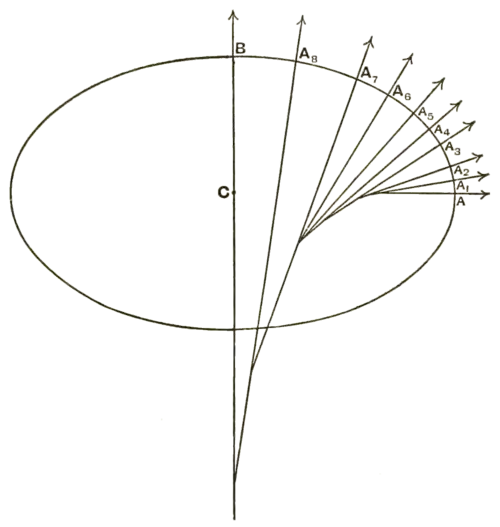 If, as in fig. 78, the shape of the earth is drawn in accordance with Newton's views, the figure shews at once that the arcs a a1, a1 a2, etc., each of which corresponds to 10° of latitude, steadily increase as we pass from a point a on the equator to the pole b. If the opposite hypothesis be