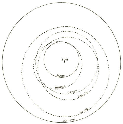 principle (chapter xi., § 243) be most effective: for instance, at a distance from the sun about five-eighths that of Jupiter, a planet would by Kepler's law revolve exactly twice as fast as Jupiter; and accordingly there is a gap among the minor planets at about this distance.
