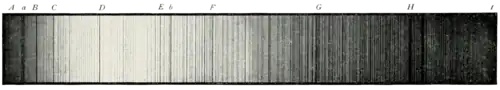 97.—Fraunhofer's map of the solar spectrum. (The red end of the spectrum is on the left, the violet on the right.)