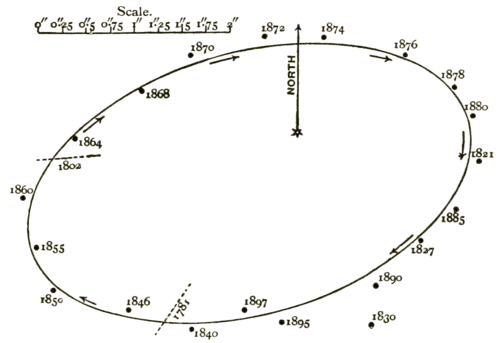 In addition to a number of minor papers Struve published three separate books on the subject in 1827, 1837, and 1852.[1] A comparison of his own earlier and later observations, and of both with Herschel's earlier ones, shewed about 100 cases of change of relative positions of two members of a pair, which indicated more or less clearly a motion of revolution, and further results of a like character have been obtained