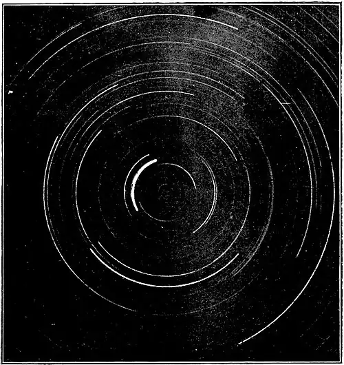 Fig. 2.—The paths of circumpolar stars, shewing their movement during seven hours. From a photograph by Mr. H. Pain. The thickest line is the path of the pole star.