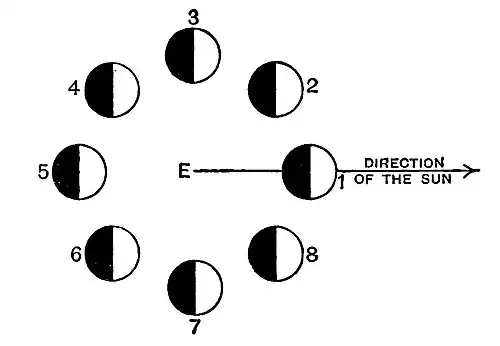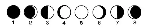 through the familiar phases of crescent, half full, gibbous, full moon, and gibbous, half full, crescent again.[1]