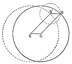 Fig. 19.—The epicycle and the deferent. by Apollonius, the epicycle. The body the motion of which is to be represented is supposed to move uniformly round the circumference of one circle, called the epicycle, the centre of which in turn moves on another circle called the deferent. It is in fact evident that if a circle equal to the eccentric, but with its centre at e (fig. 19), be taken as the deferent, and if s' be taken on this so that e s' is parallel to c s, then s' s is parallel and equal to e c; and that therefore the sun s, moving uniformly on the eccentric, may equally well be regarded as lying on a circle of radius s' s, the centre s' of which moves on the deferent. The two constructions lead in fact in this particular problem to exactly the same result, and Hipparchus chose the eccentric as being the simpler.