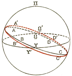 to an equal motion in the opposite direction of the point ♈︎, say from ♈︎ to ♈︎' (fig. 22), i.e. by a motion of the equator from ♈︎ n to ♈︎' n', its inclination n' ♈︎' m remaining equal to its former amount n ♈︎ m. The general effect of this change is shewn in a different way in fig. 23, where ♈︎ ♈︎' ♎︎ ♎︎' being the ecliptic, a b c d represents the equator as it appeared in the time of Timocharis, a' b' c' d' (printed in red) the same in the time of Hipparchus, ♈︎, ♎︎ being the earlier positions of the two equinoctial points, and ♈︎', ♎︎' the later positions.
