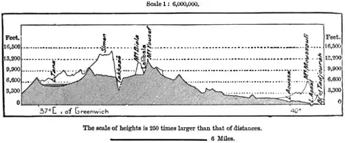 be seen on descending into the abyss, walking for hours on the edge of giddy precipices, crossing the torrents at the bottom, and then scaling their abrupt sides. The defiles are occasionally blocked by masses of rock swept down by the mountain torrents, and presenting serious obstacles to the local traffic. The most remark- able ravines occur along the eastern edge of the plateau, where the total fissure exceeds 6,500 feet, measured from the summit of the degas down to the sea-level. Nowhere else can a more convincing proof be observed of the erosive action of running waters. The two walls of certain gorges, rising nearly vertically within a few feet of each other to a height of some hundreds of feet, represent an erosion of hard rock amounting to at least ten thousand five hundred million cubic feet. Nevertheless, the waters have regulated the fall of the channel, which averages not more than one in forty yards. This incline is easily ascended, but several of the defiles remain blocked for months together by the mountain torrents; every year new paths have to be formed across the debris, while some have had to be entirely abandoned. The route to Kumaili, through which the English army marched to the Abyssinian plateau, had probably not been occupied by a military force since