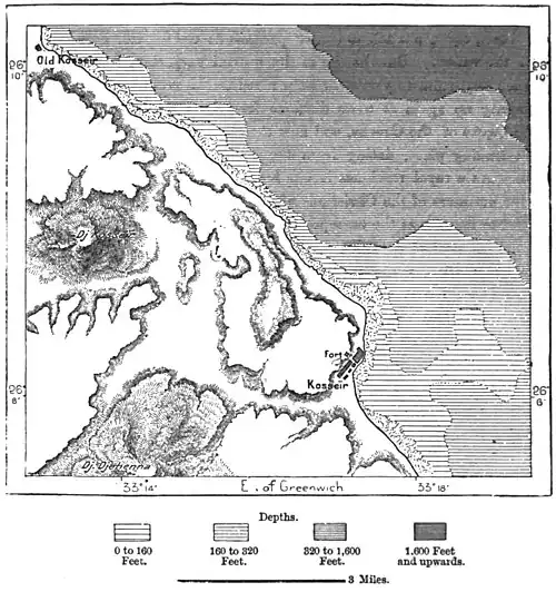 The present town of Kosseir stands on an almost flat beach, in front of which the shipping is obliged to anchor in an exposed roadstead. But the smaller Arab craft find a shelter close inland, where they are protected by a coral reef from north and north-east winds. The dilapidated fort commanding the town was built by the French during the Egyptian expedition under Bonaparte. Kosseir is badly supplied with wells, which explains its scanty vegetation. The only real fresh water comes all the way from the Nile; but most of the inhabitants are fain