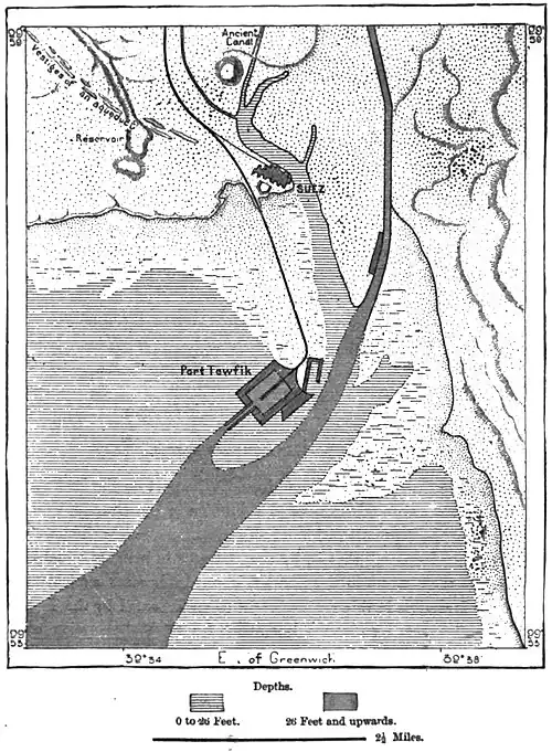 Before the opening of the Suez Canal, Cairo was connected with its port on the Red Sea by a direct line of railway, crossing the desert through the depressions followed by the ancient pilgrims’ route. The present seaport of Suez, lying at the