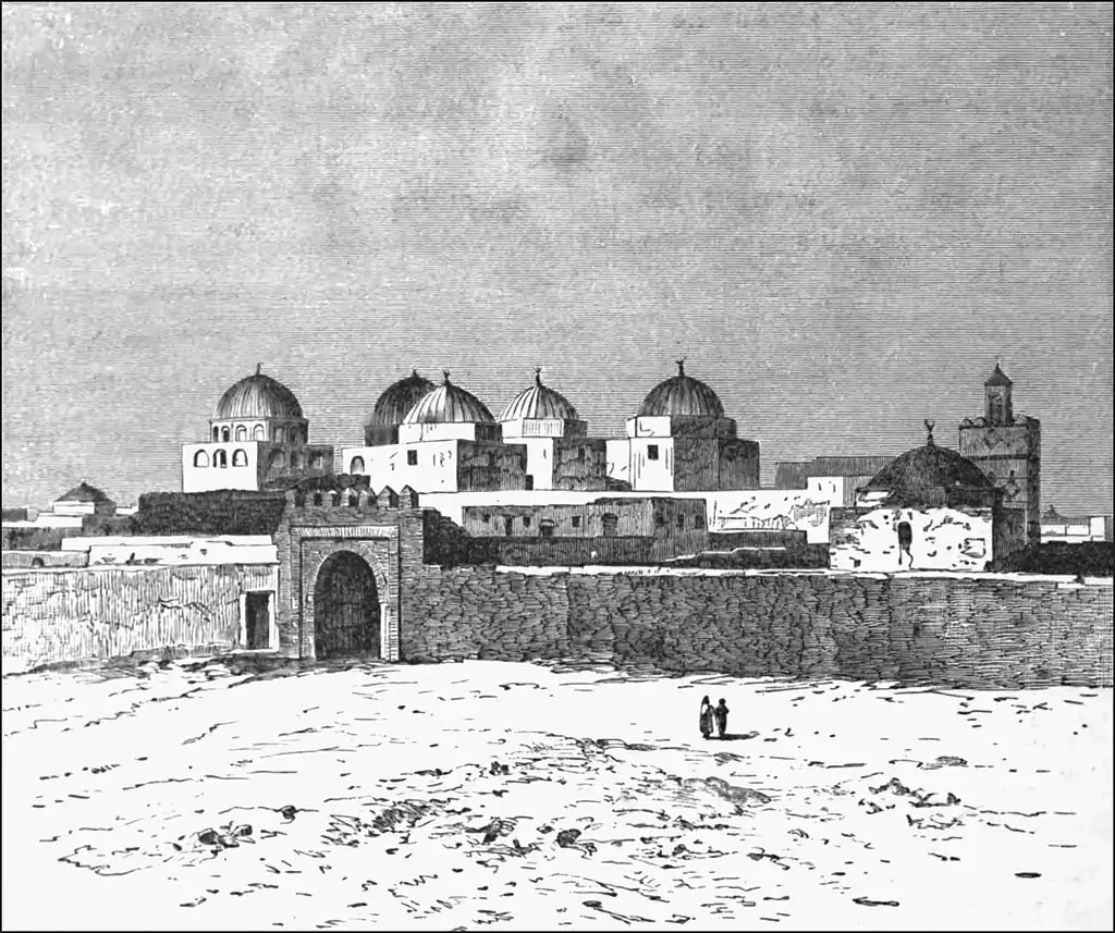 Viewed from afar, it commands the surrounding space with its lofty walls, the numerous cupolas of its mosques, and the superb three-storied minaret which stands north-east of the town, above the mosque of Sidi-Okbah. Tunis itself does not boast of such wealthy mosques and convents as this holy city, which possesses over eighty of these religious edifices. Amongst them is the Jemâ-el-Kebir, or "Great Mosque," which has no less than seventeen double parallel naves, and more than 400 columns of onyx, porphyry, marble, and other precious materials. Still more famous than the Great Mosque is that of the "Companion," so called because it contains, in a recess ornamented with marvellous arabesques, the tomb of a companion