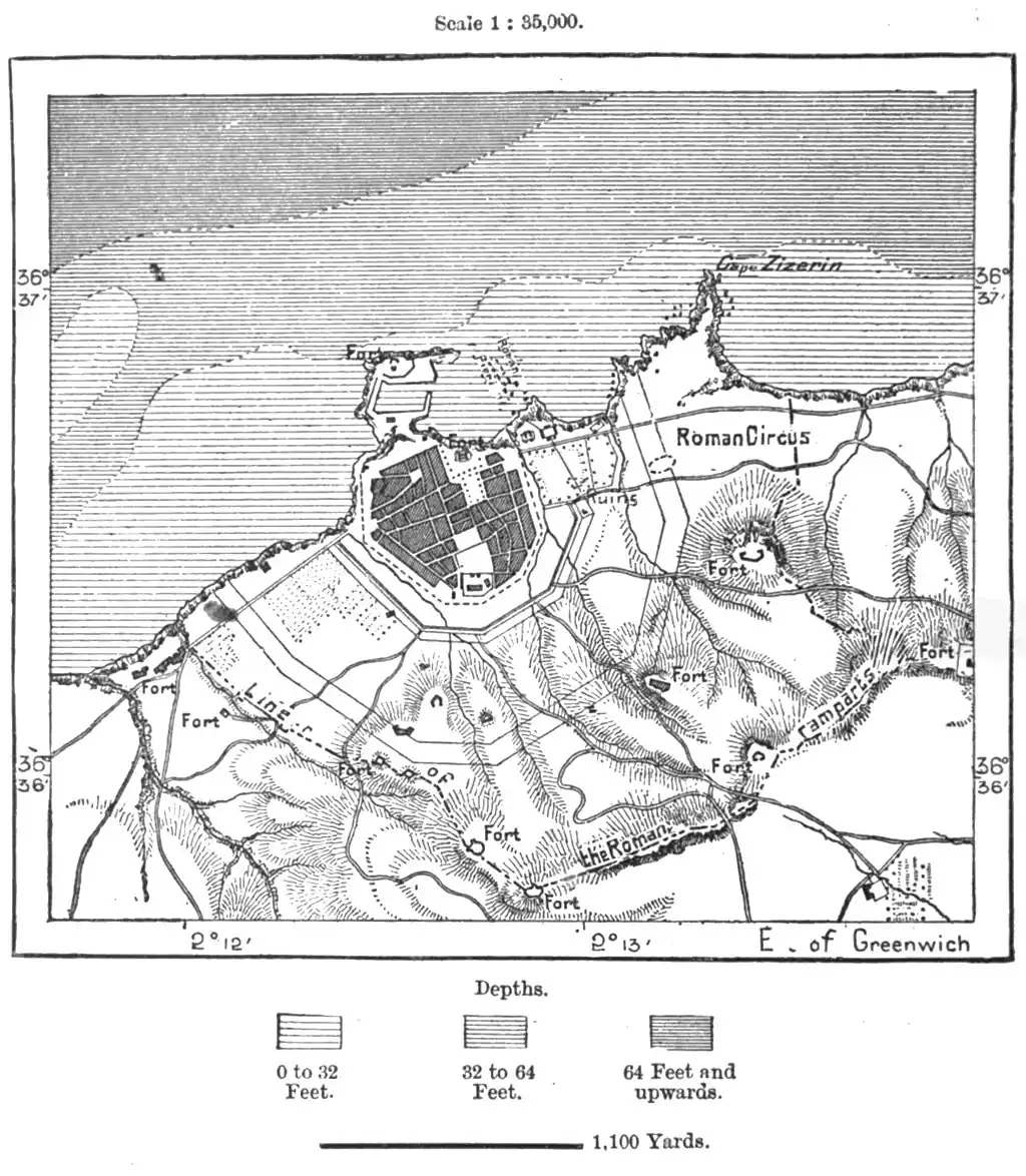 West of Shershell follow the modern settlements of Novi and Guraia, and the ruins of the ancient Gunugis, the latter occupying near the mouth of the Wed Dahmus a much better position as a seaport than the neighbouring Tenes. This place, lying almost in the centre of the Dahra coast between Tipaza and Mostaganem, owes its relative importance rather to the iron, copper, lead, and silver mines of the surrounding district. Successor of the Roman Cartennæ (or "Car Tenne", that is "Cape Tennæ," in Berber), it consists of two quarters, the old town