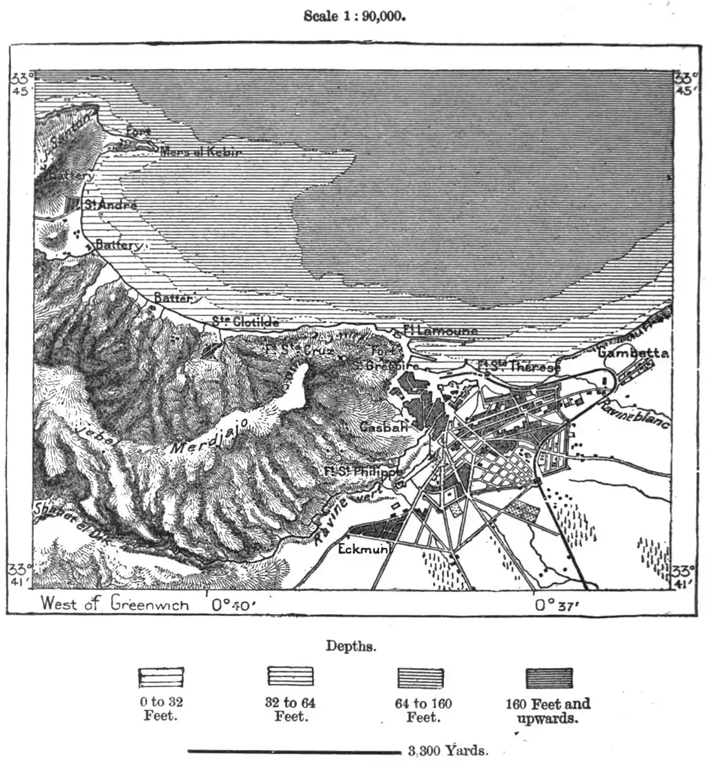 is encircled by steep cliffs, affording no space for a large town. Hence Oran lies at the extremity of the bay, where the hills disappear, leaving a wide opening landwards. From the strategic point of view this breach also offers great advantages, being defended by a natural fortress, adding greatly to the strength of the enclosures.