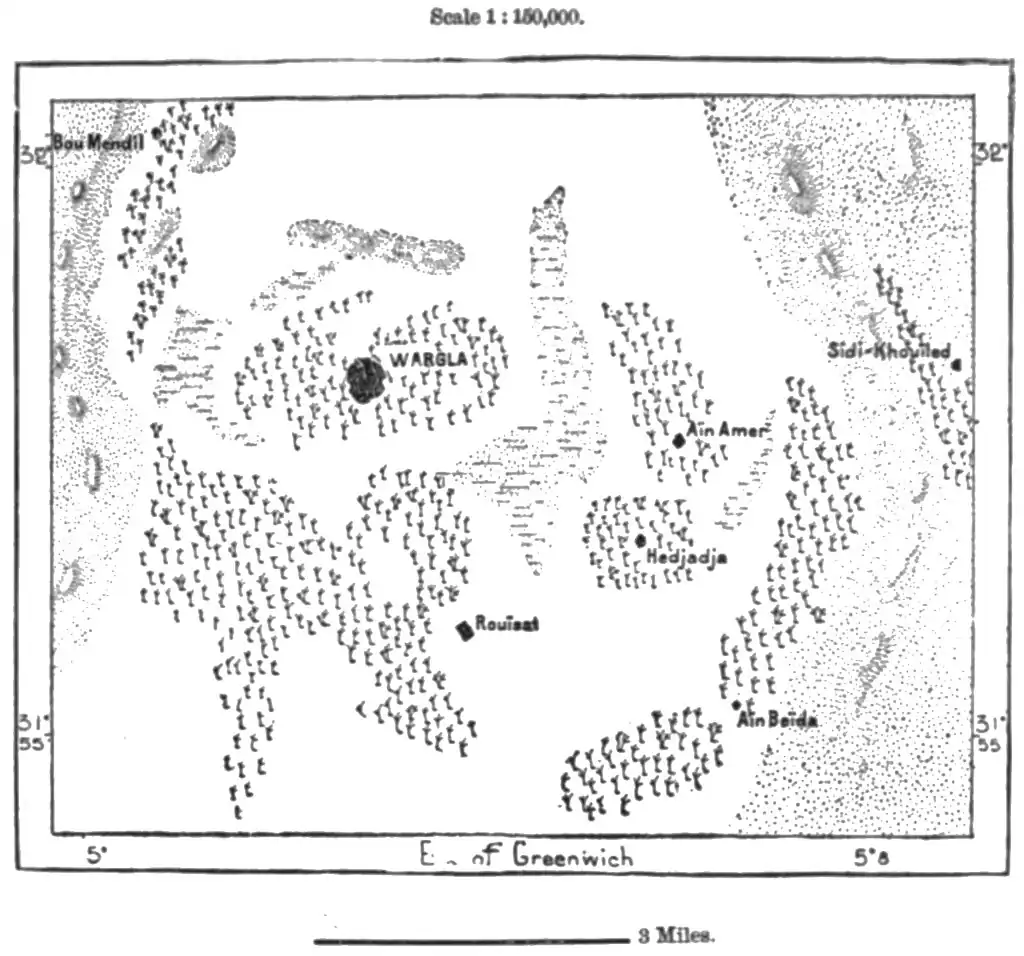 Beyond Wargla and Nguga a few palm thickets are scattered over the hollows of the Wed Maya. But the whole population is as nothing: to what it must have been at a time when the ruins occurring at so many points were flourishing towns, surrounded by cultivated lands. Towards the north, the plain of El-Hajira, about midway between Wargla and Tugurt, was covered with villages, while the town of Bagdad stood on the margin of a now dried-up shott. The most remarkable place in the district was Sedrata (Cedrata, Ceddrata), which has been somewhat too grandiloquently called the "Saharian Pompeii." Under the dunes rolling away