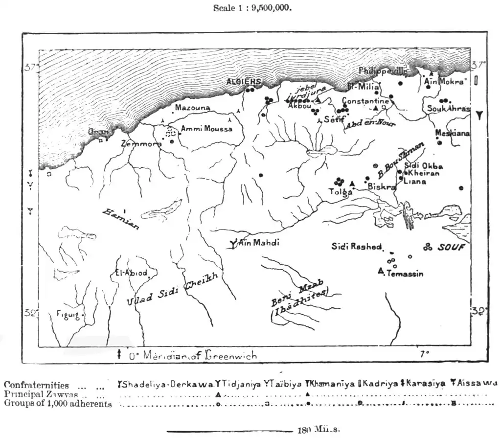 Although unofficially connected with the French Government, the marabuts (marâbot) are a source of little danger to the new régime. Belonging for the most part to old families, whose genealogies go back to a remote past, accustomed to live on regular alms of the faithful, residing always in the vicinity of the holy places of pilgrimage, the marabuts are all well known to the French officials, with whom it is to their interest to live on the best of terms. Many even accept service under the Government, allowing themselves to be appointed aghas or kaids, and even intriguing for honours and decorations. Amongst the marabut tribes, one