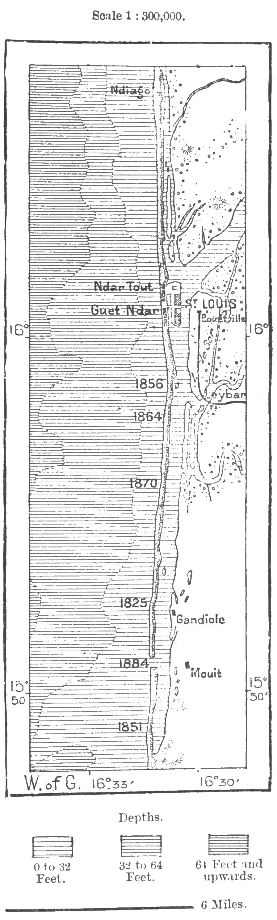 During the present period the bar at the entrance of the river has constantly changed its form and position. For a stretch of 13 miles below Saint-Louis, the breach in the sandy dyke has continually shifted up and down, according to the abundance of the fluvial discharge, the force and direction of the fluvial and marine currents, and of the winds and surf. Usually the bar is slowly displaced southwards, owing to the gradual extension of the sandy dyke formed by the combined action of the parallel marine and fluvial currents, both trending in the same direction. But as it gains in length, this narrow tongue becomes more exposed to the pressure of the river, yielding sooner or later at some weak point. It happens at times that the sill breaks into eight or ten distinct channels; but these openings are soon filled up by the action of the two conflicting currents, leaving only a single passage, through which the lighter fresh water spreads over the marine surface, while the heavier salt water penetrates up the river-bed. In 1825 the bar nearly faced Gandiole, 8 miles south of Saint -Louis; in 1851 it had shifted still farther south, almost to the southern extremity
