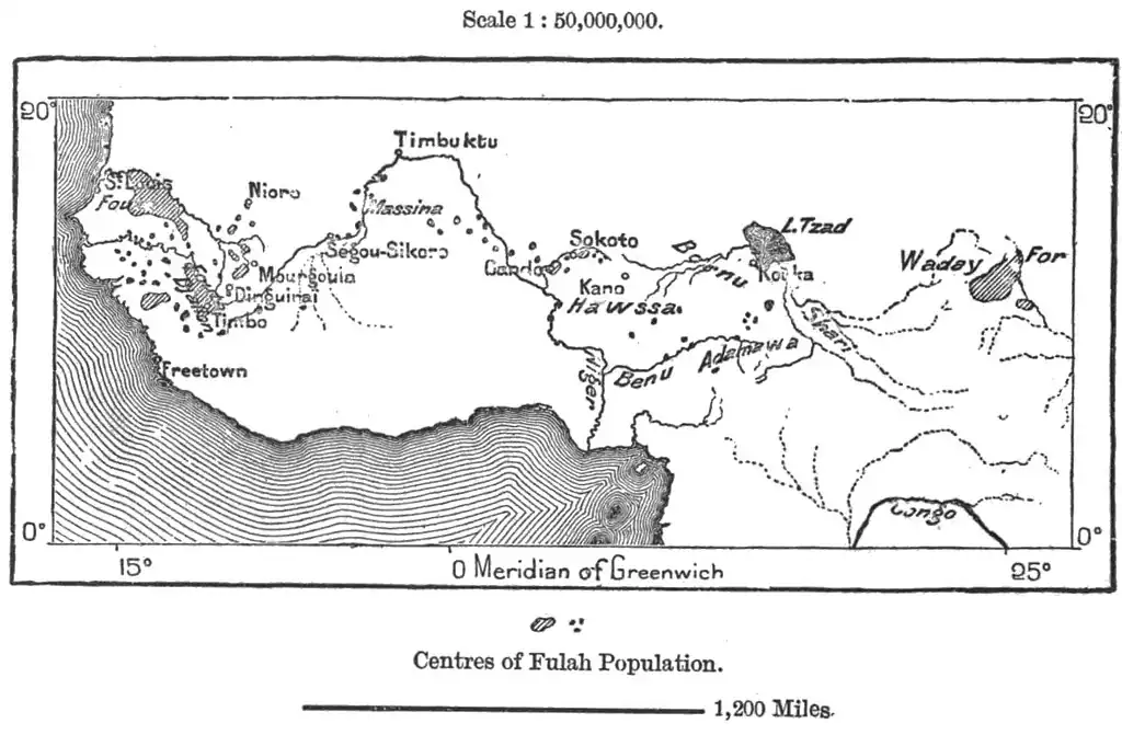 These Fulahs, a foreign race entirely distinct from the surrounding Negroes, have wedged themselves in between the blacks of the seaboard and those of the Niger. Here they are more numerous and present a more compact national body than in any other part of Sudan, throughout which region they are scattered in more or less powerful communities for a space of about 2,700 miles. They are met as far east as Darfur, while in the west they have penetrated to the Nunez, Pongo, and Mellicory coast streams. Their colonies stretch north and south for 600 miles