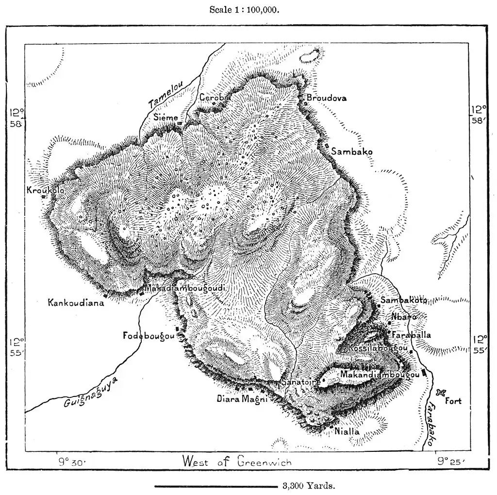 Timbo, capital of Futa-Jallon, lies 2,560 feet above sea-level in a hilly district encircled by the semicircular valley of the Bafing and traversed from south to north by one of its head streams. This royal capital is not a large place, consisting only of some groups of cone-shaped huts half buried in verdure at the foot of two neighbouring hills. The descendants of the original founders, who came from Massina less than two centuries ago, have alone the right to reside in Timbo, where,