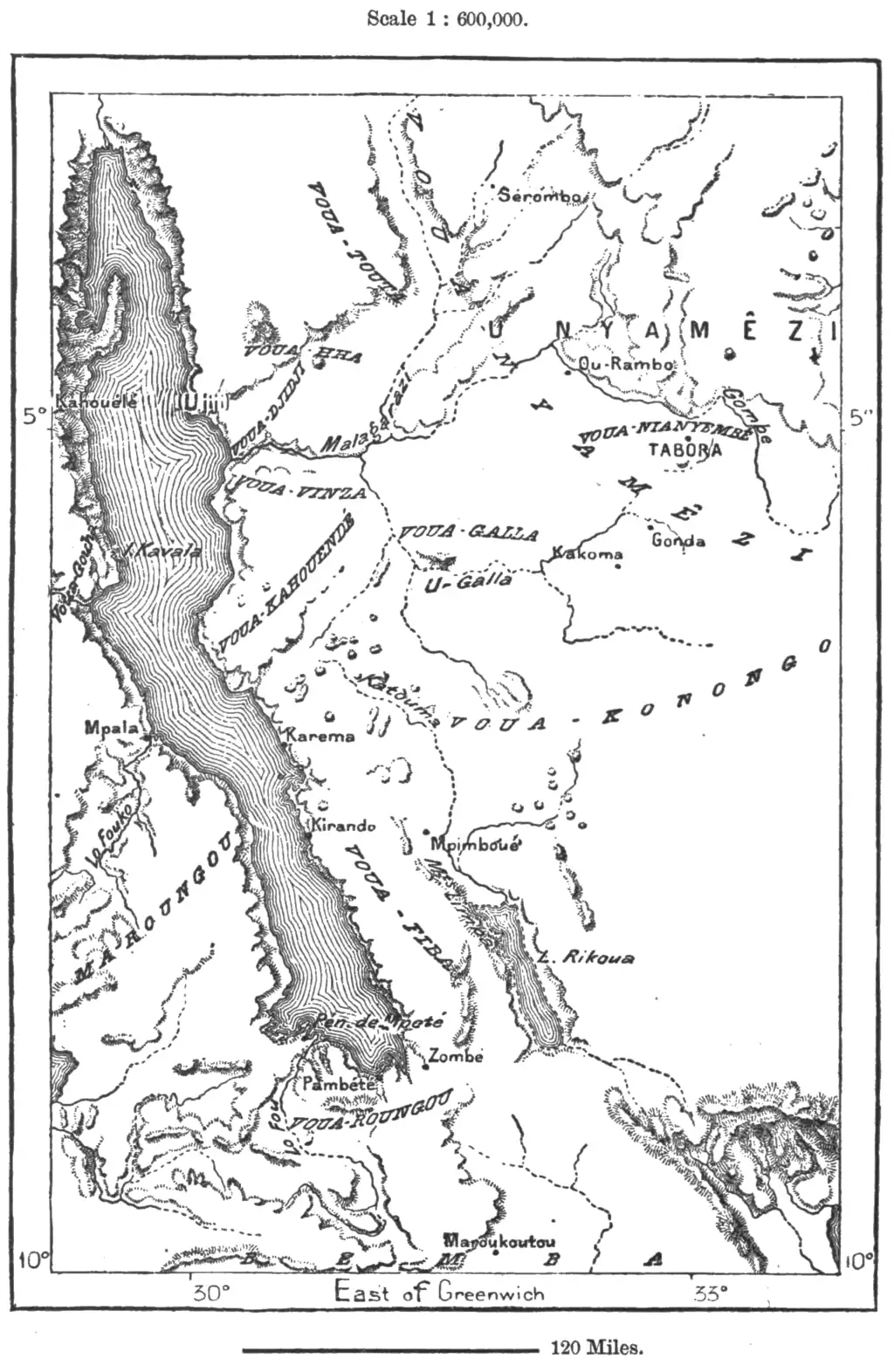 The Vua-Jiji are noted boat-builders, who show with pride many large decked barges, which were the queens of the lake before the Europeans had launched their steamers on its waters. Under their white instructors they have become skilful pilots, and no longer find it necessary to offer so many sacrifices of goats or poultry to the spirits of the storm when rounding the dangerous headlands. The difficulties