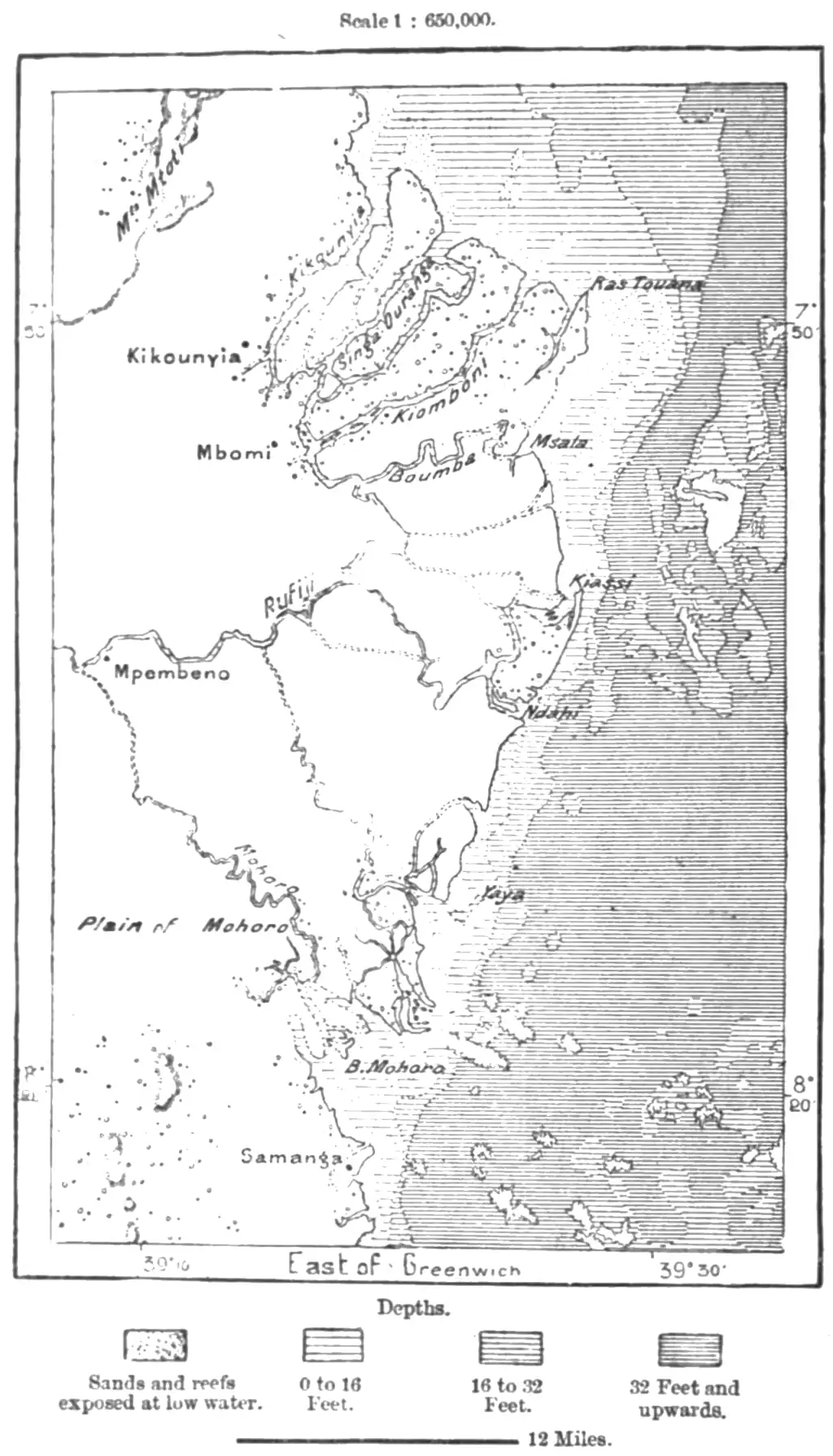 In the Mrima, or coast region below the Pangani Falls, the Rufiji is navigable for the rest of its course seawards, a distance altogether of about 120 miles. But